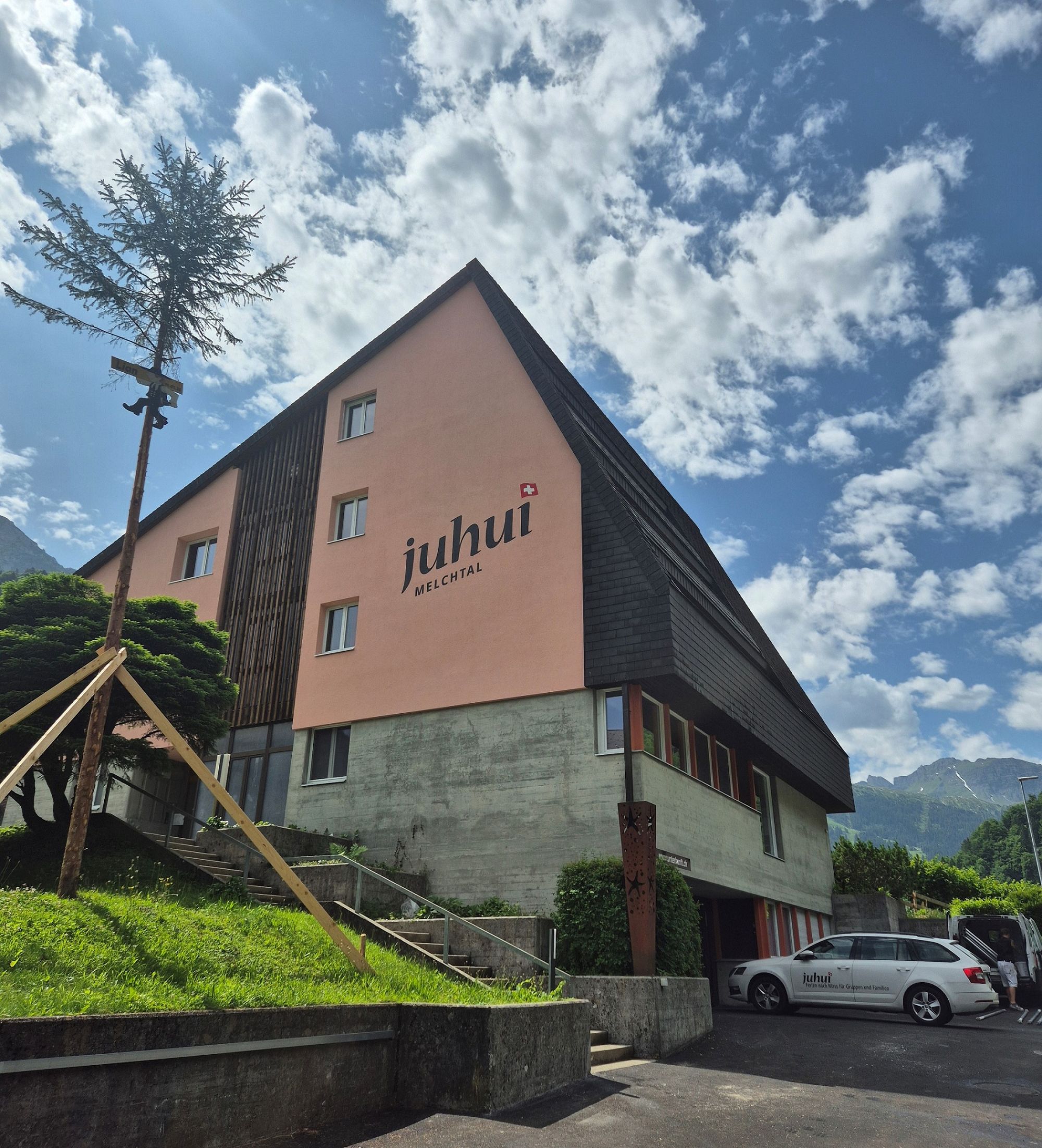 Aus der 30-jährigen Familienhelferinnenschule ist das komfortable Ferienhaus juhui Melchtal entstanden. Das Haus hat 22 Zimmer mit 76 Schlafplätzen + 3 Zustellbetten, eine grosszügige Küche, mehrere Aufenthaltsräume und einen Esssaal. Duschen und Toiletten sind auf allen Stockwerken vorhanden. Im juhui Melchtal sind auch für eine beschränkte Anzahl Gäste rollstuhlgängige WC's und Duschen vorhanden. Die Umgebung, die Fassade, der Parkplatz wie auch 10 Zimmer wurden im Jahr 2025 komplett saniert.